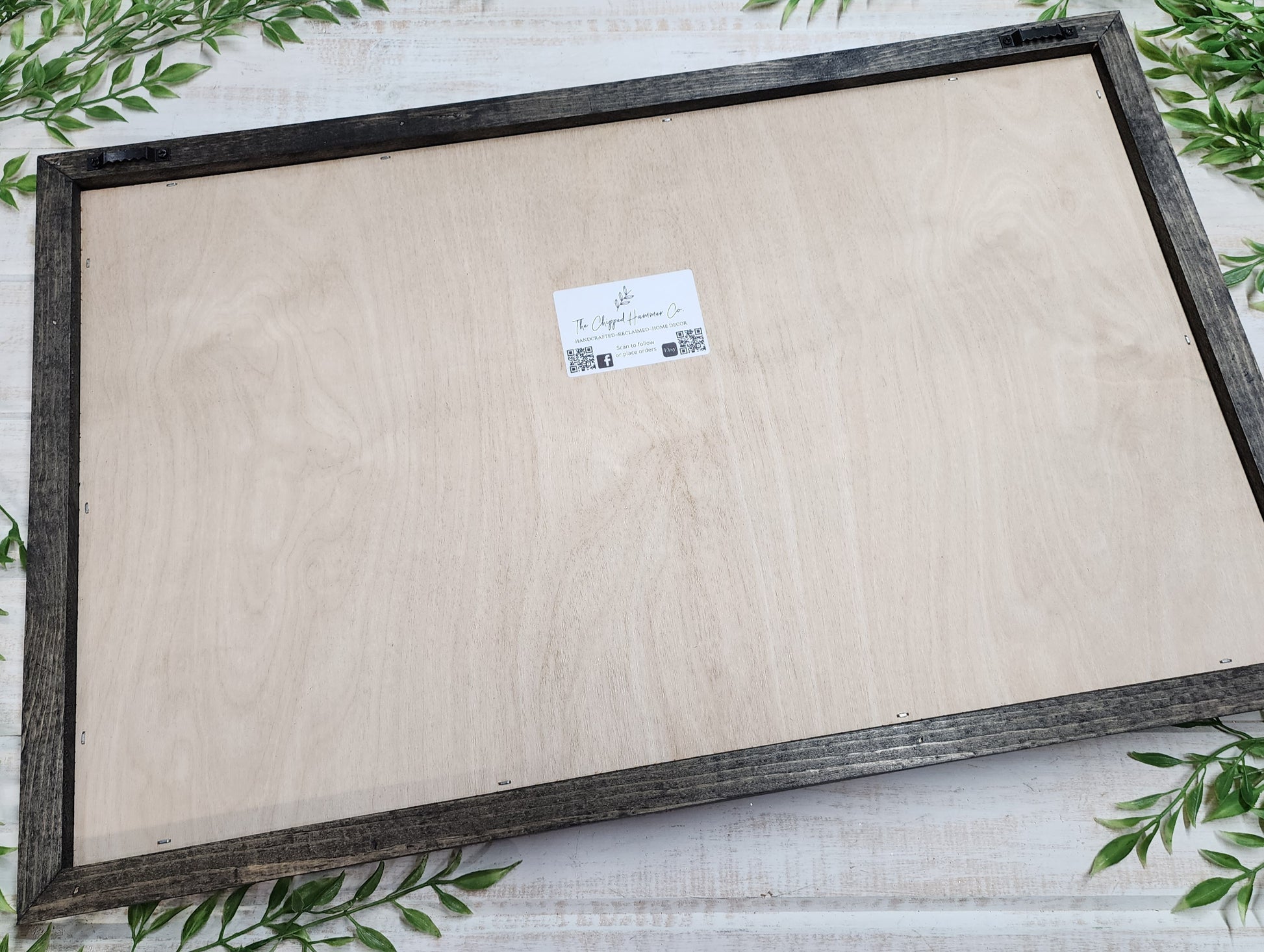 Map measures: 23.75"Wx15"Tx1.5"D (maps vary in size slightly as they are all handcrafted upon order) Our maps are framed with an 1.5" pine frame, stained to your choice. We also offer 6 stain choices for the frame color, to help match your current homes decor!