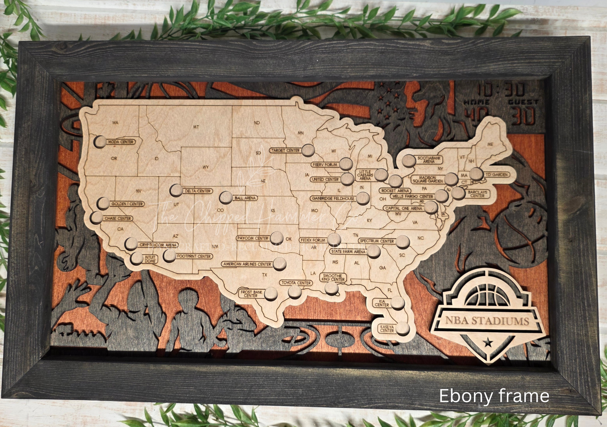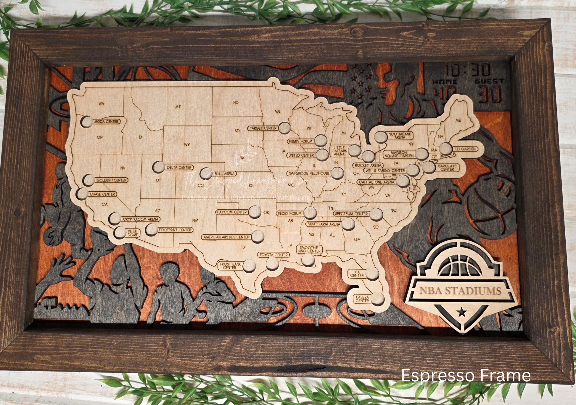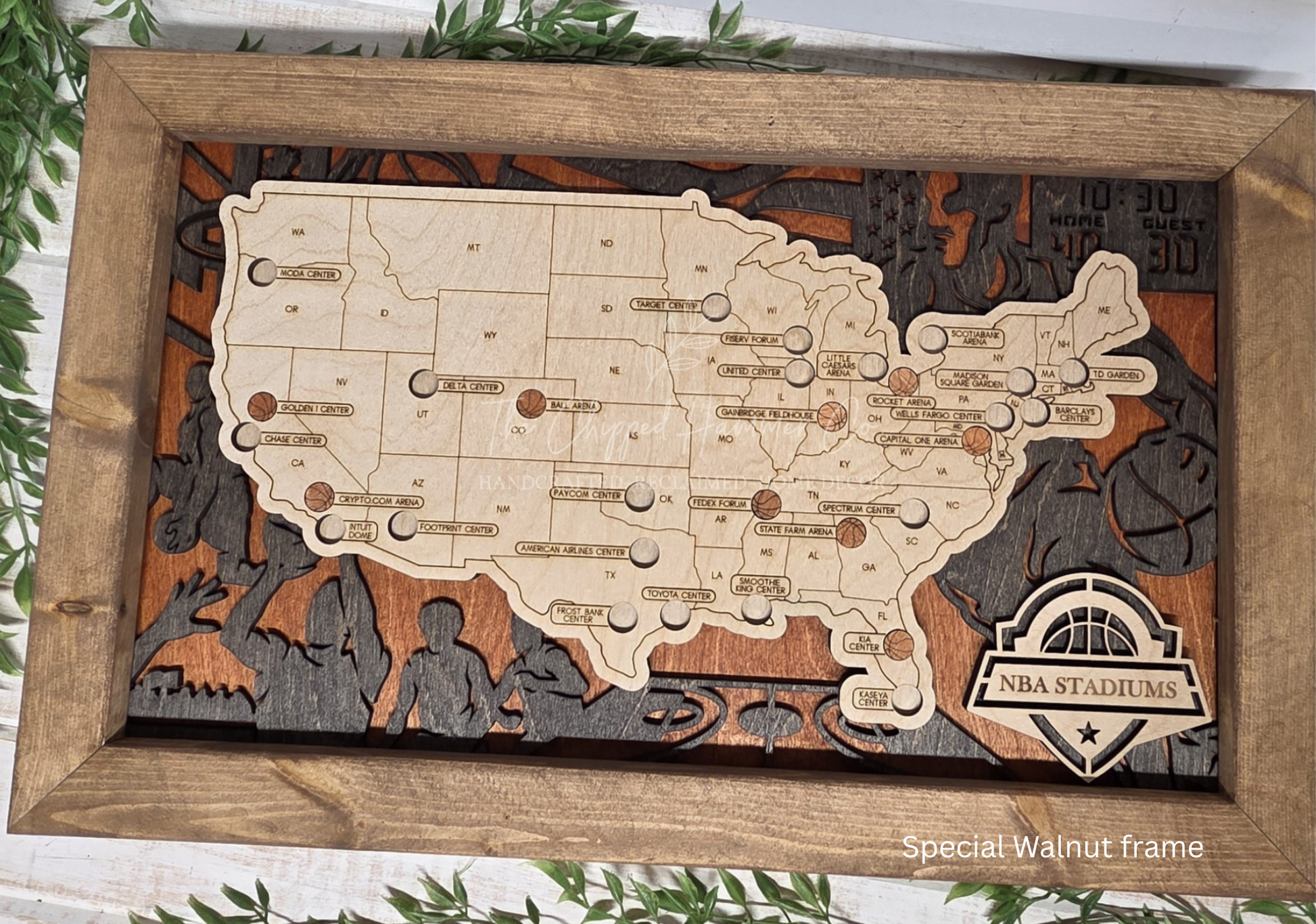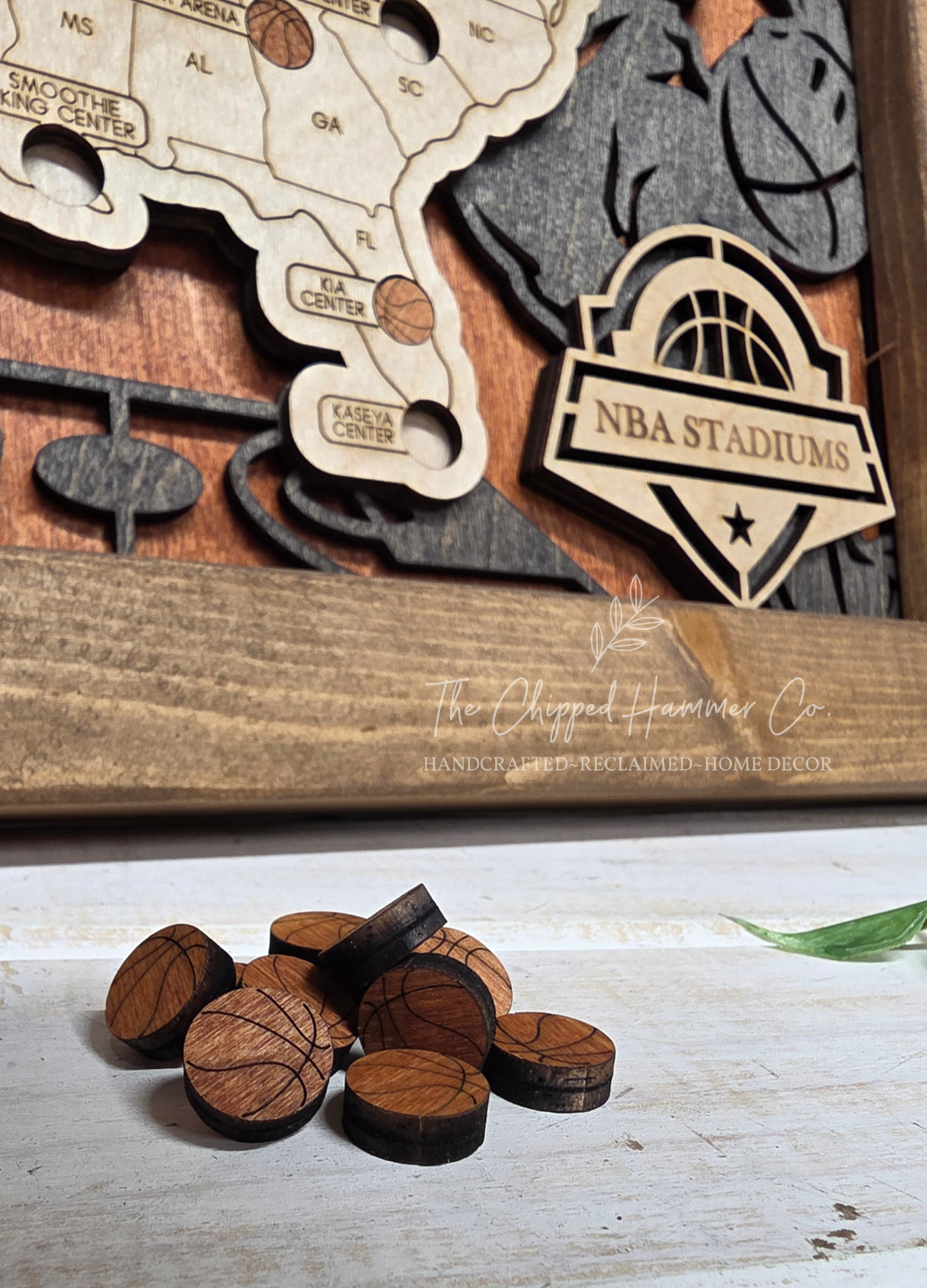 This handcrafted wooden Basketball Stadium map is the ultimate gift for ball fans of all ages!! This map is perfect for tracking your visits to all the basketball stadiums across the U.S. AND comes with metal tooth hangers on the back to make this a true one of a kind piece of artwork (and story telling) for years to come!